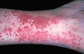 20. D is the correct answer. Vasculitis typically presents as a deep red, pink, or purple lesions on the extremities. They are usually scattered such as in the picture. Cellulitis tends to be together and solid. Folliculitis has a more pustular appearance. Contact dermatitis typically does not have a deep red appearance.